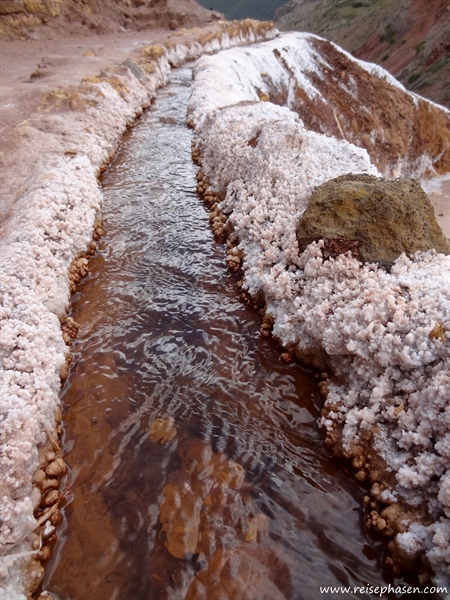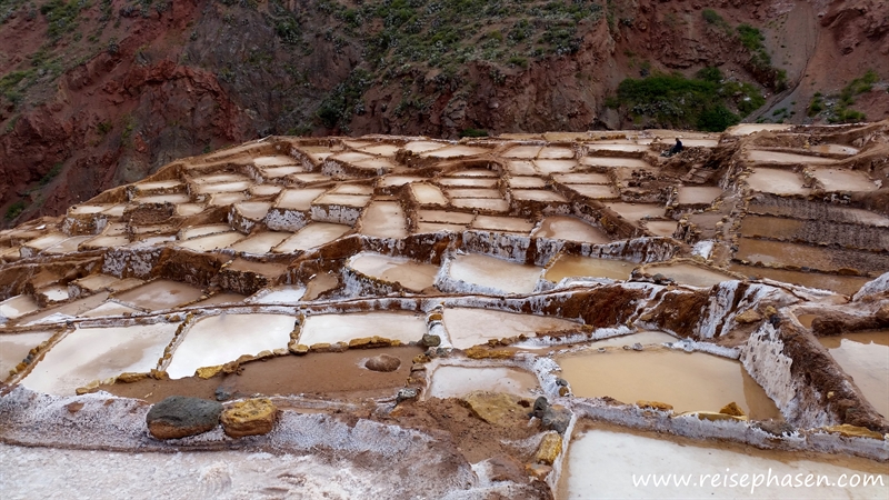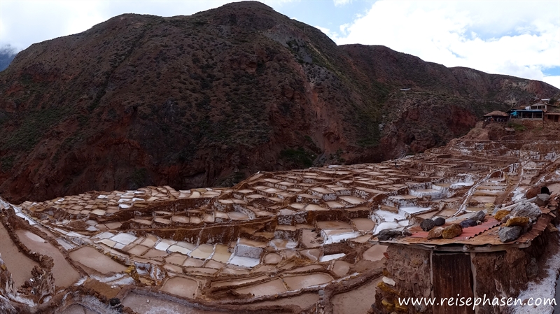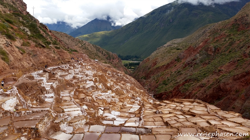 Anschließend ging unsere Fahrt weiter zum zweiten Ziel, den Salzsalinen Salineras de Maras. Der Blick vom Aussichtspunkt war gigantisch und wir konnten uns kaum vorstellen, wie aus einer einzigen salzigen Quelle, durch Menschenhand, dieses Geflecht aus Kanälen und hunderten von Terrassen zu Stande kam. Die Salzterrassen Maras stammen noch aus der Zeit der Inka. 3000 Becken befinden sich bis heute an den steilen Hängen der Bergschluchten von Urubamba. Die Salzgewinnung findet auf rein natürlichem Wege statt. Das salzhaltige Wasser wird über ein ausgeklügeltes Kanalsystem in die gerade einmal 30 cm tiefen Becken geleitet. Die hohe Sonneneinstrahlung lässt das Wasser verdunsten und zurück bleibt das schneeweiße, kristalline Salz – das sogenannte Weiße Gold der Anden. Es war ein überwältigendes Erlebnis alles einmal zu sehen!