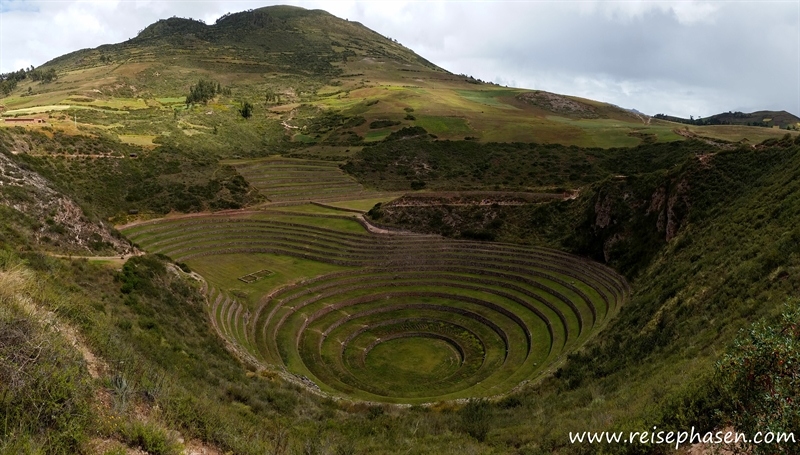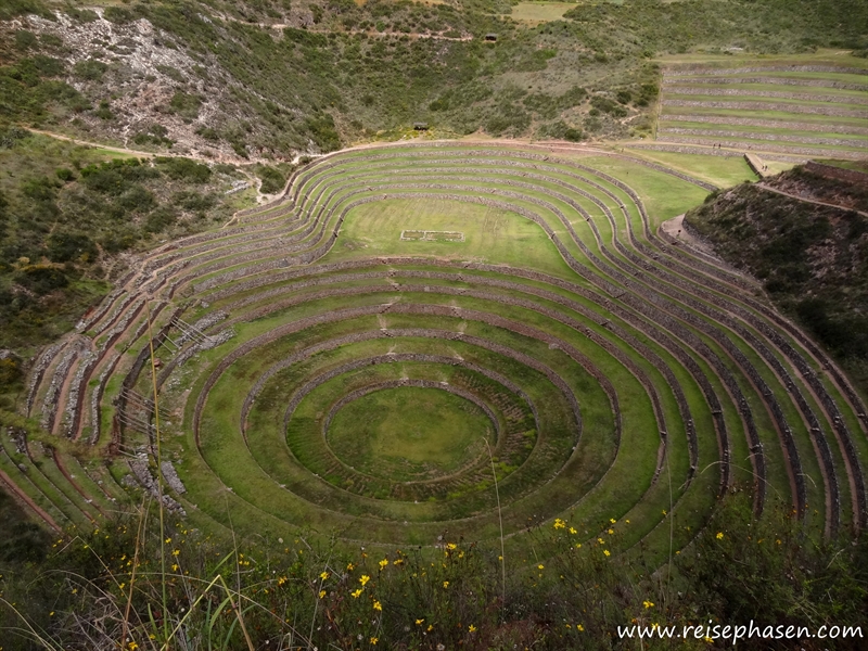 Das dritte Ziel war Moray, eine sehenswerte Inka-Stätte, ganz in der Nähe von Maras. Als wir ankamen konnten wir uns nicht erklären wozu die Terrassenanlage früher diente. Wir hatten die Idee, dass sie früher z.B. als Theater genutzt wurde. Oh je aber nein, verkehrt. 😉 Wir haben gelesen, dass diese kreisförmige Terrassenanlage den Inka für landwirtschaftliche Experimente diente. Sie erprobten die Tauglichkeit verschiedenster Produkte auf den unterschiedlichen Stufen der Terrassen. Höhe und Mikroklima der einzelnen Terrassenstufen spielten, wie die Inka herausfanden, eine wesentliche Rolle beim Anbau von Gemüse und Getreidesorten. Sehr interessant!