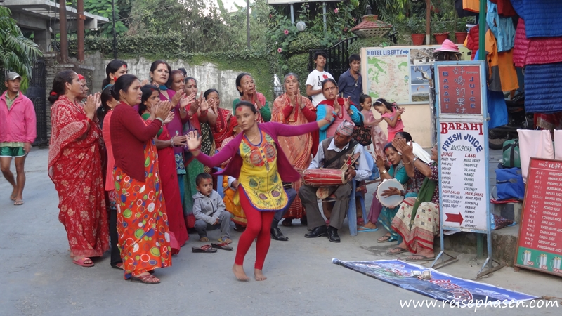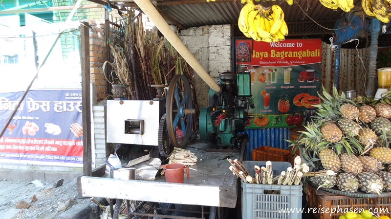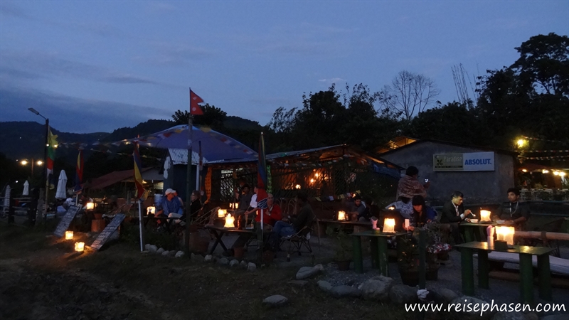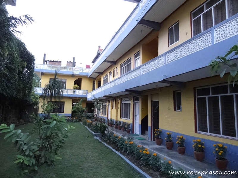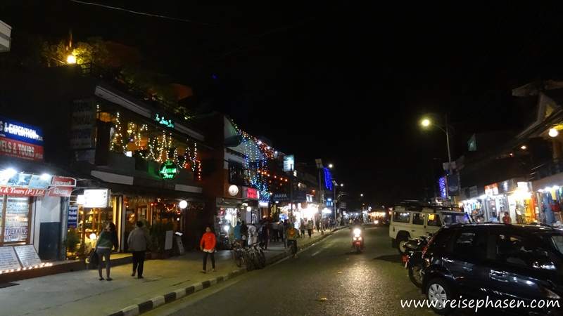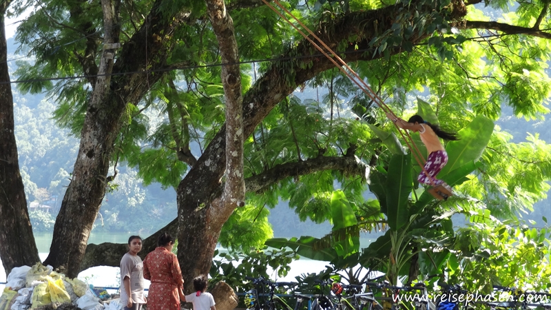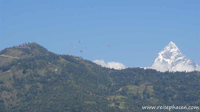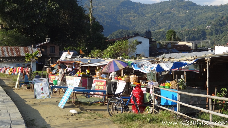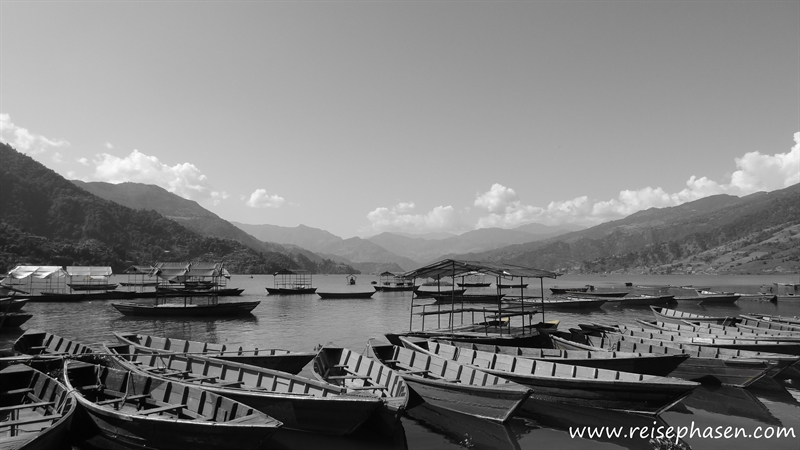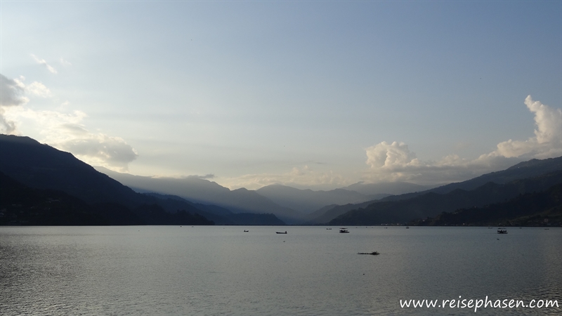 Länger als 2 – 3 Tage hält man es in Kathmandu wegen des Lärms und Drecks nicht aus. So entschieden wir uns mit dem Bus (1000Rs/8€/2P) ins 200 km entfernte Pokhara zu fahren (Ausgangspunkt für Trekking Touren in der Annapurna Region). Nach 7 h holpriger Fahrt kamen wir an. Wir suchten uns eine Unterkunft in der Nähe des Pewa See’s. Eigentlich war unser Ziel die Umrundung des Annapurna Massiv’s gewesen. Wegen dem Unglück eine Woche zuvor entschieden wir uns kurzer Hand für einen anderen Trek. Trotzdem wollten wir einen Abstecher in diese Region machen. Die ersten Tage in Pokhara relaxten wir am See in einer der gemütlichen Bars mit frischen Fruchtsäften (100Rs/0,80€) für die Damen und natürlich Bier für die Herren. 😉 Seit langem gab es für unseren Geldbeutel mal wieder bezahlbares Obst, Säfte und westliches Essen. :-)) Yummie… Unsere Abende ließen wir stets bei einem der guten Italiener bei Pizza und Nudeln ausklingen. Von unserem Gästehaus hatten wir morgens einen herrlichen Ausblick auf das Annapurna Massiv.