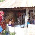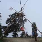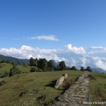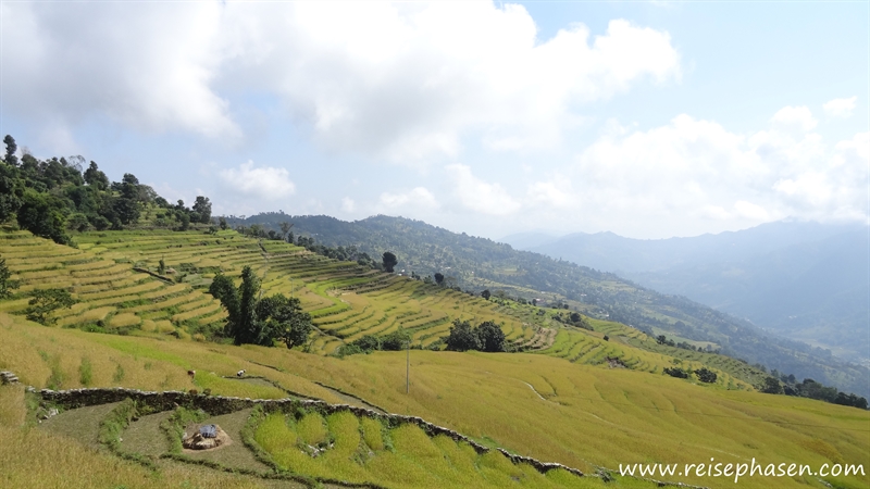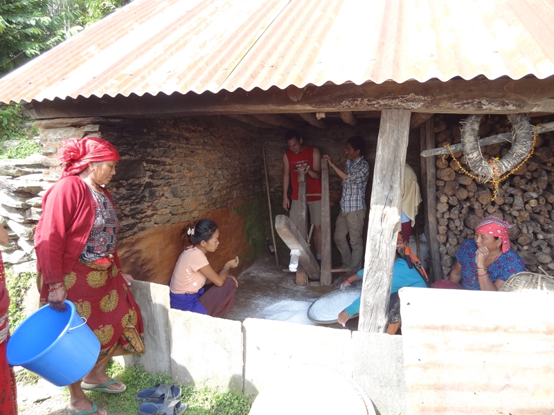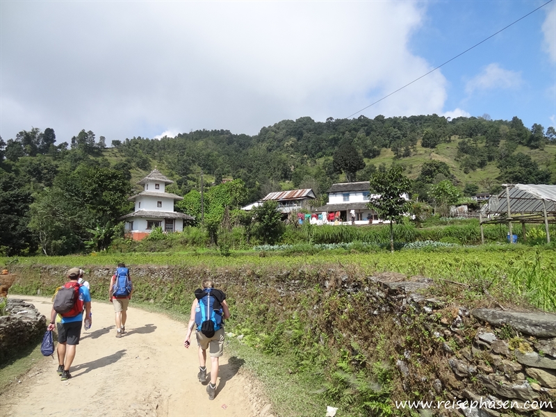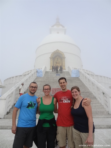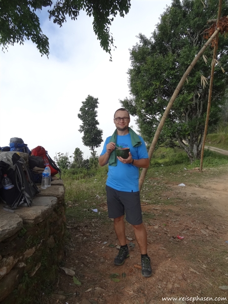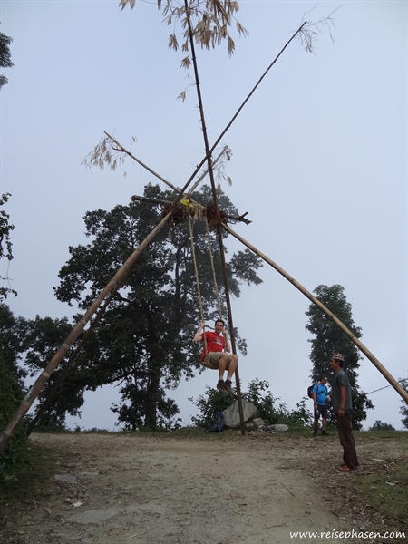 Zwei Tage faulenzen war aber genug. Wir beschlossen einen kleinen zwei Tages Warm-Up Trek in diesem Gebiet zu machen. Die Entscheidung viel auf den Panchase Trek. Wir packten unsere kleinen Rucksäcke und los ging es. Das Taxi brachte uns zu unserem Startpunkt, der Friedensstupa hoch über Pokhara. An diesem Morgen lag ganz Pokhara im Nebel. Die Stupa mit ihrer weißen Farbe war kaum zu sehen. Hinter ihr folgten wir einem Pfad der später zu einem Feldweg wurde. Wir kamen an einigen kleinen Dörfern vorbei. Immer wieder kamen Kinder herbei gelaufen und fragten uns nach unserem Namen, woher wir kommen und ob wir Schokolade für sie hätten. Später trafen wir einen Inder der ein Stück des Weges bis zu seinem Haus mit uns lief wo er mit seiner Familie seit einiger Zeit wohnt. Er ist Lehrer im Nachbarort. Er lud uns zu sich nach Hause ein und stellte uns seine Kinder und Frau vor. An der Seite des Hauses in einer kleinen Scheune waren ein paar Einheimische die mit den Füßen einen Holzbalken antrieben womit Getreide gedroschen wurde. Jochen ließ es sich nicht nehmen und probierte es direkt aus.