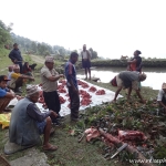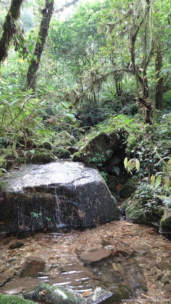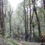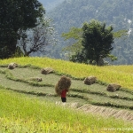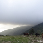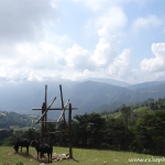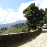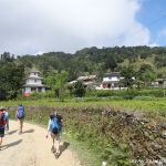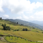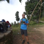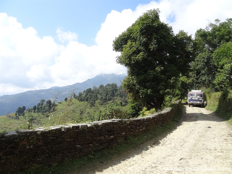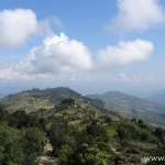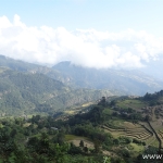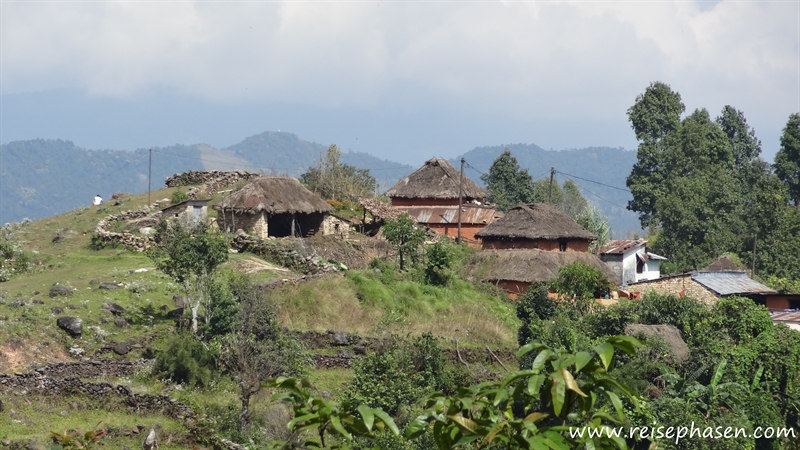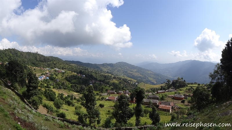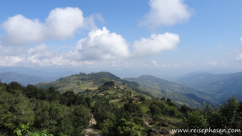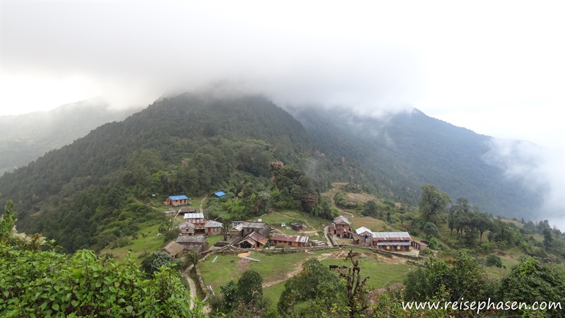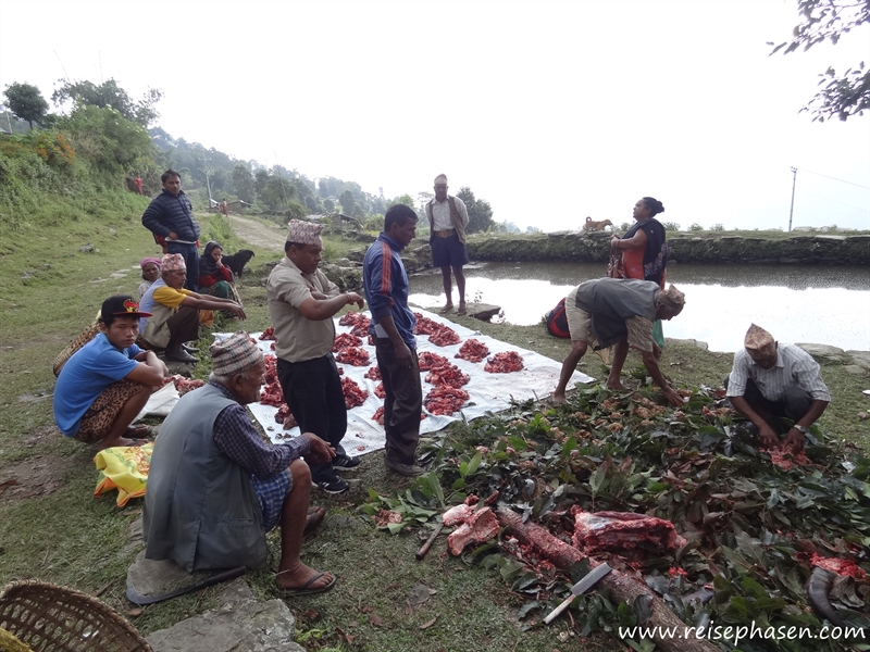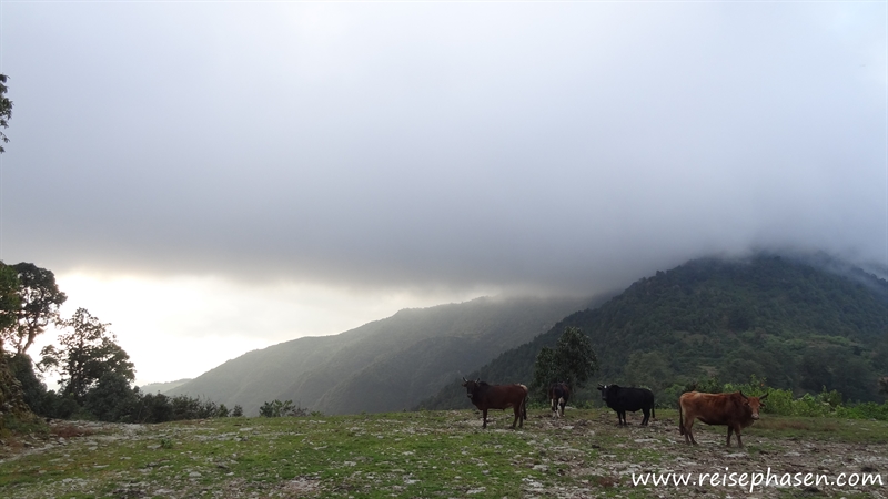 Danach ging es für uns schnell weiter, da der eigentliche Startpunkt für diesen Trek noch vor uns lag. Ein paar Orte weiter trafen wir auf eine Dorfgemeinschaft die gerade dabei war einen Büffel zu schlachten. Dieser wurde komplett zerlegt und in gerechte Portionen für alle Dorfbewohner geteilt. Wieder ein paar Meter weiter hörten wir auf einmal eine Hupe und schwups war er schon an uns vorbei gesaust… 😉 Wir wunderten uns schon sehr das hier in der Abgeschiedenheit Busse fahren. Gut für die Einheimischen das sie mittlerweile an die Zivilisation angeschlossen sind. Ansonsten hatten wir schöne Aussichten und sahen Arbeiter in den Reisterrassen bei der Ernte. Nach 3 h gemütlichen Gehens kamen wir gegen 13:00 am eigentlichen Startpunkt des Treks an. Die Einheimischen die wir trafen rieten uns davon ab weiter zu wandern, da das Ziel noch schwer vor Dunkelheit zu erreichen wäre. Für die nächsten 6 -7 h würde es durch den Dschungel Nepals gehen, ohne Rast und Unterschlupfmöglichkeiten. Doch wir entschieden uns dagegen und legten einen Zahn zu (oder mehrere ;-)). So ging es Berg auf und Berg ab durch den Dschungel. Ausgeschildert war der Weg nicht wirklich gut. Unterwegs fanden wir 2 – 3 Schilder mit Panchase, aber an Stellen wo es sowieso nur eine Wegrichtung gab. Dafür fanden wir an Stellen wo uns vier Pfade zur Auswahl standen keinen Wegweiser. So waren wir auf unseren Orientierungssinn, der uns bis zum Ende nicht im Stich ließ, angewiesen. Stündlich legten wir kurze Verschnaufpausen ein. Denn eins wurde uns schnell klar, im Dunkeln den Weg zu finden, ohne sich zu verletzen, würde schwierig werden. Jochen legte zusätzlich noch einige Pirouetten auf den nassen klitschigen Steinen ein. Bis zum Ende gefühlte 10 mal. 😉 Die ersten 3 h ging es mitten durch den Wald, immer wieder an Lichtungen und Weiden vorbei. Später über einen Bergkamm von dem man eine gute weite Sicht hatte. Das Wetter verschlechterte sich. Es wurde kühler, der Himmel bestand aus dunkeln Wolken und Nebelschwarten zogen auf. Die letzte Stunde ging es über eine sich im Bau befindende Straße. Bis wir schließlich nach nur 5 h unser Ziel Panchase auf 2100 m noch kurz vor der Dunkelheit und Regen fix und fertig erreichten.