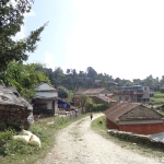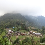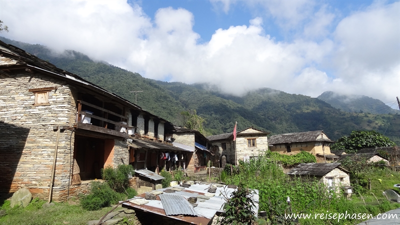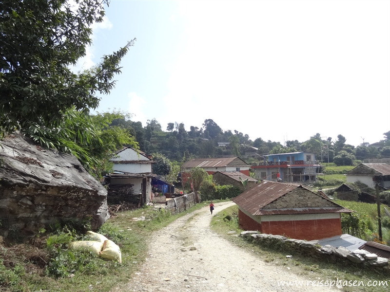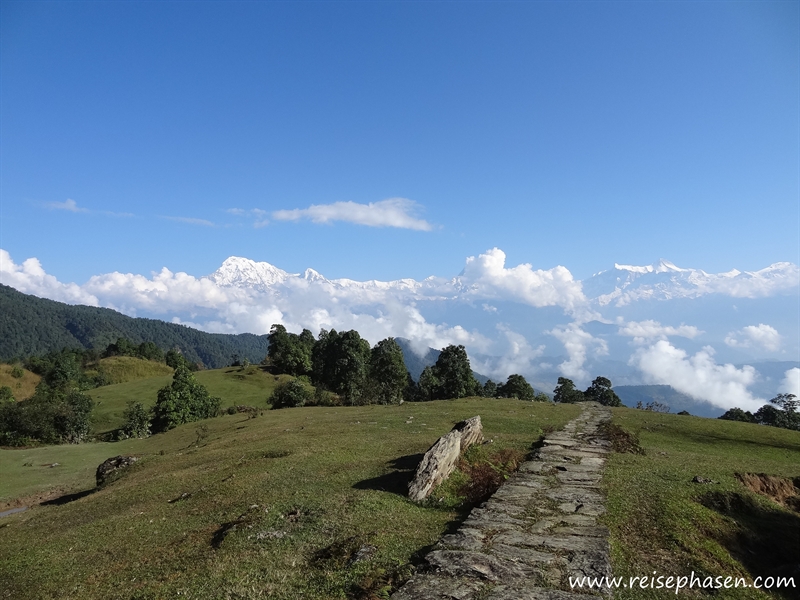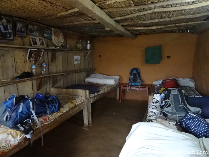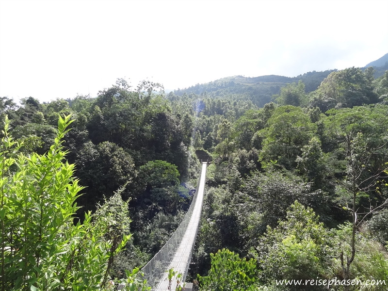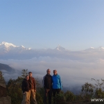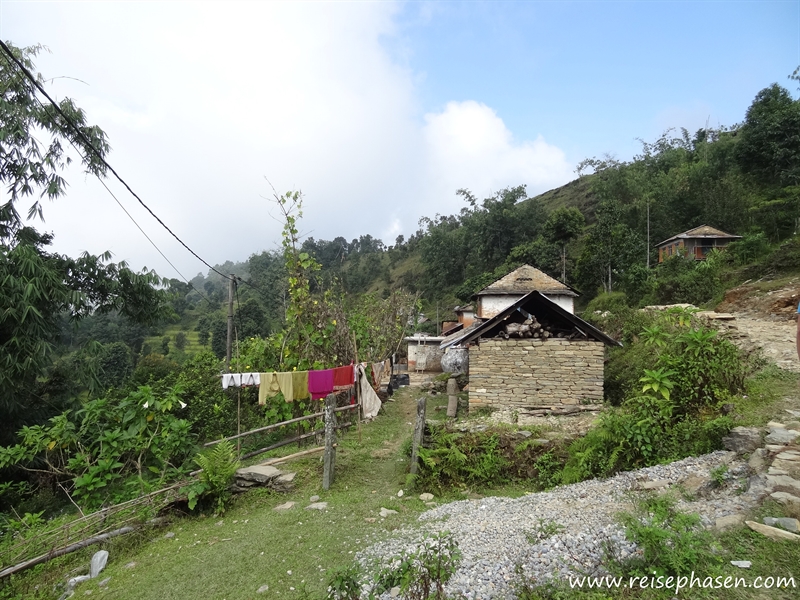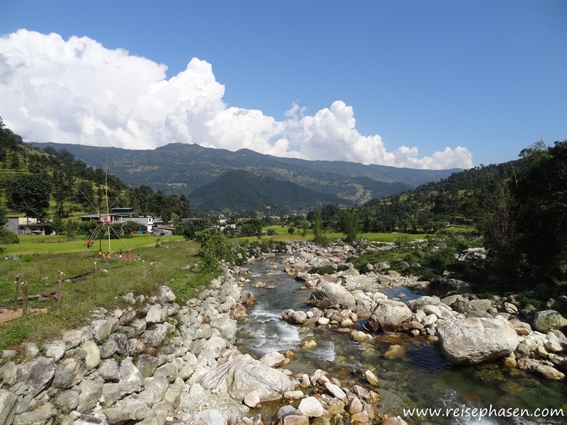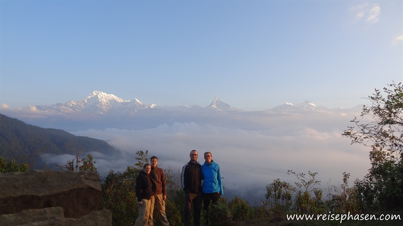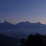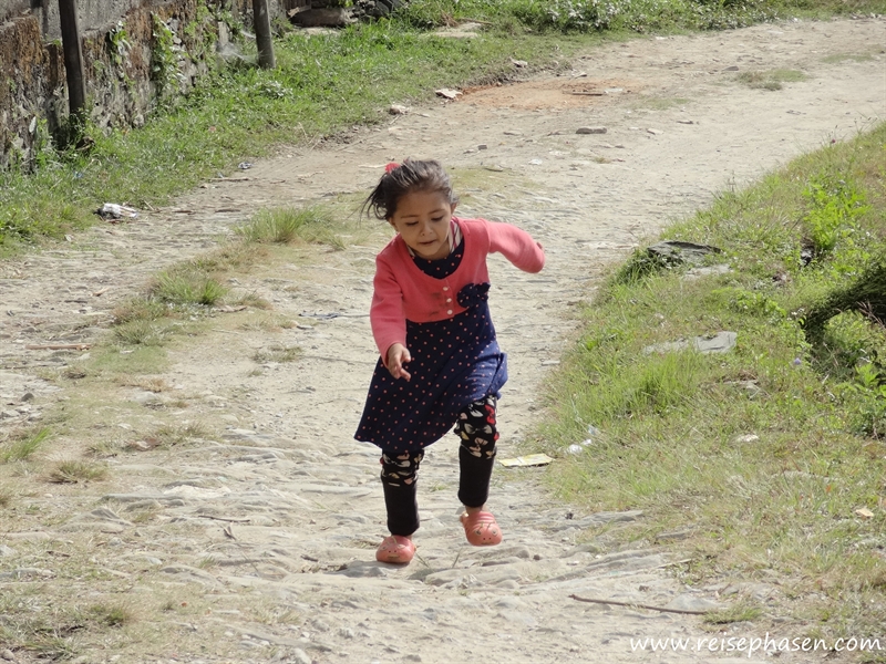 Panchase besteht aus drei Gästehäusern. Wir suchten eins aus und teilten uns für diese Nacht zu viert ein Zimmer (500Rs/4€/4P). Die Familie war nett und bereitete uns ein gutes Abendessen vor. Wir zwei Lisa’s machten noch einen kurzen Spaziergang durch das Dörfchen und trafen dabei auf eine Gruppe Schweizer. Als sie uns fragten ob auch wir voller Blutekel seien, kontrollierten wir erst mal schnell unsere Arme und Beine. Gott sei Dank hatten wir keinen abbekommen, Glück gehabt. 😉 Nach dem Abendessen gingen wir zu Bett. Am nächsten Morgen schauten wir uns zusammen den Sonnenaufgang an. Wir hatten einen herrlichen Blick auf das gesamte Annapurna Massiv. Danach warteten schon unsere Pfannkuchen auf uns. Gut gestärkt machten wir uns an den Abstieg. Über dutzende Treppenstufen und vorbei an Dörfern ging es hinab ins Tal. Wir überquerten mehrere Hängebrücken. An der letzten machten wir halt und kühlten unsere heiß gelaufenen Füße im kalten Gebirgsfluss. Keine halbe Stunde später kamen wir in Ghatchhina unserem Endpunkt der Tour an.
