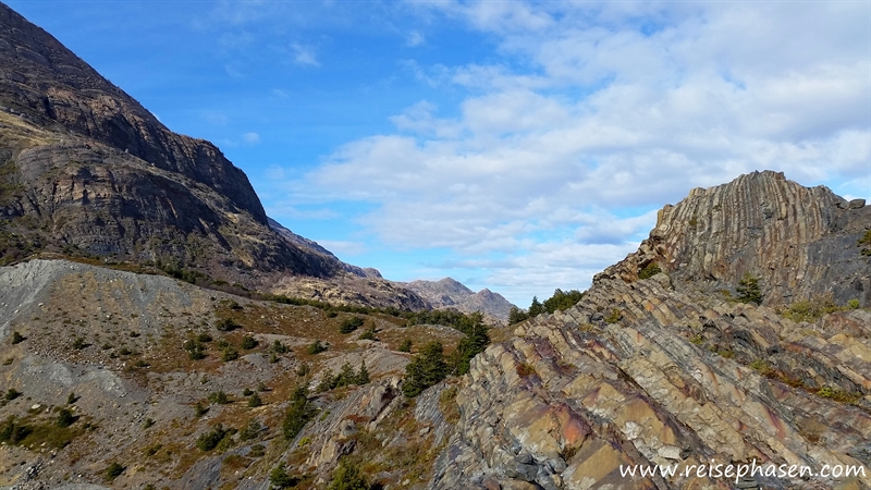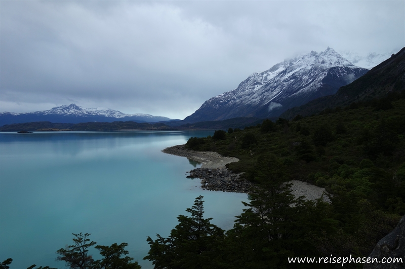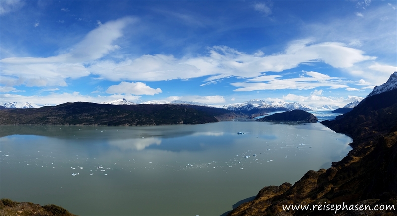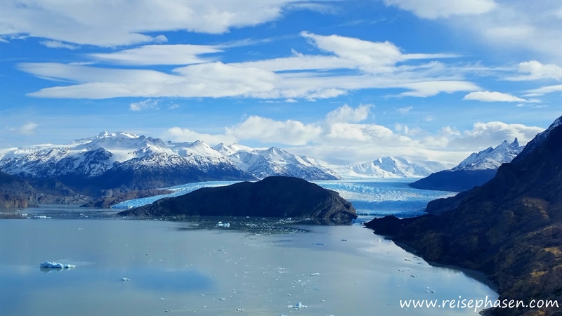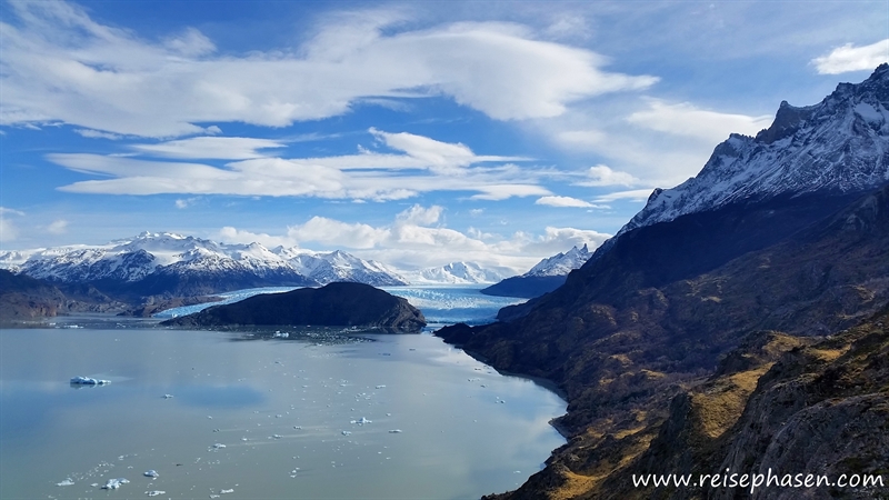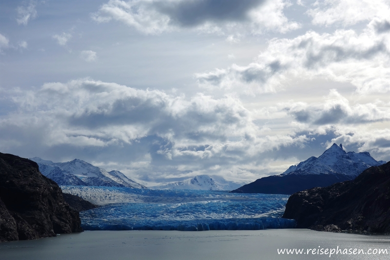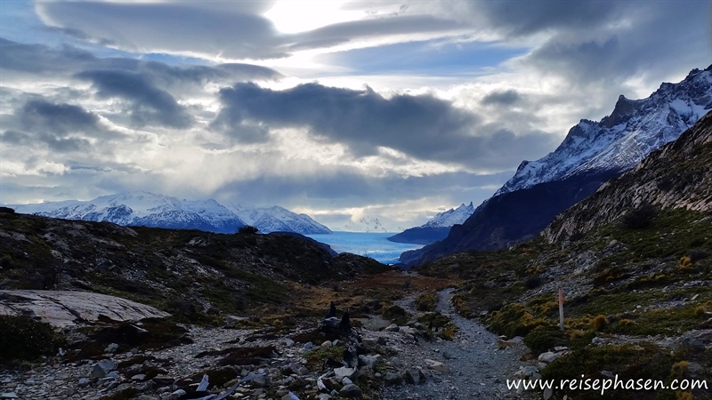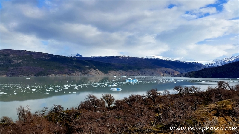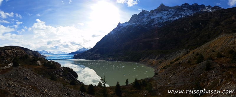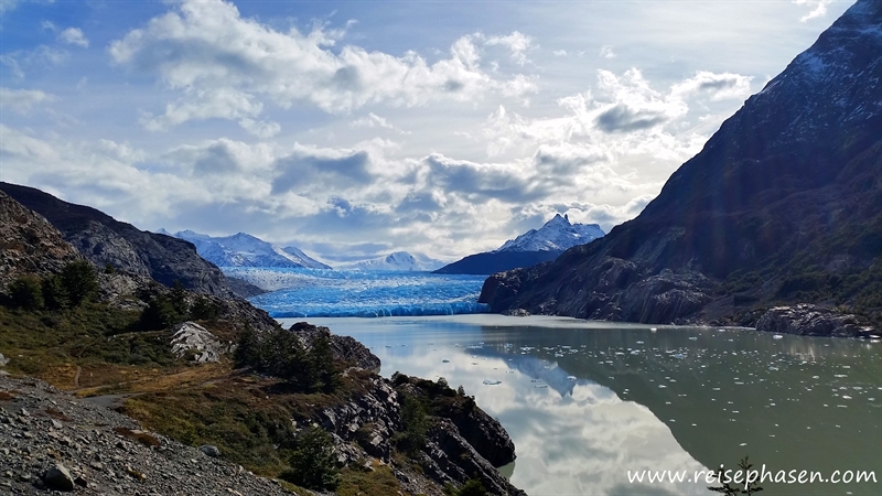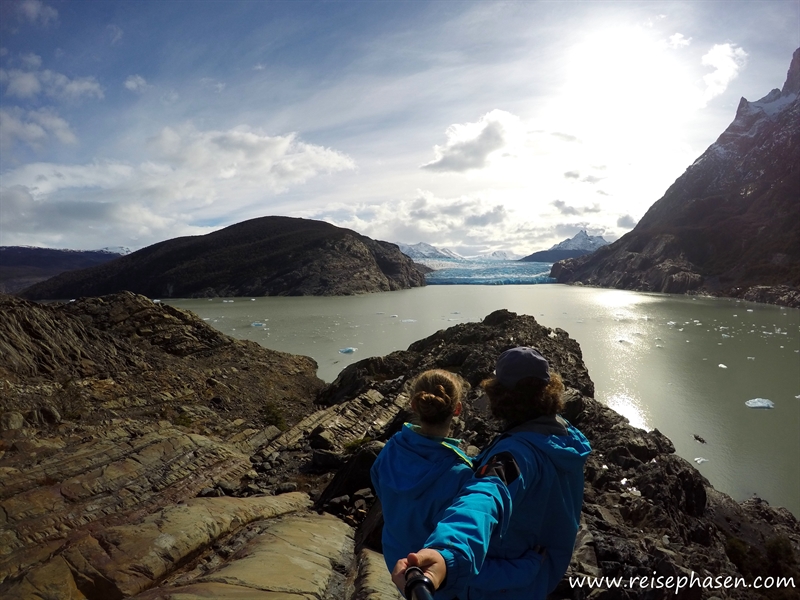 Nach der kalten Nacht kamen wir nach zwei Stunden gut aufgewärmt zum ersten Aussichtspunkt, von wo aus wir den Lago Grey mit Eisschollen und den Gletscher zum ersten Mal sahen. Wir liefen noch 1,5 Stunden weiter bis kurz hinter das Refugio Grey (im Winter geschlossen). Von einer kleinen Anhöhe aus hatten wir einen super Blick auf den vor uns liegenden Gletscher. Wir genossen das herrliche Wetter, doch viel Zeit blieb nicht, denn wir mussten wieder alles zurücklaufen. Nach insgesamt 22 km kamen wir wieder am Refugio Paine Grande an.