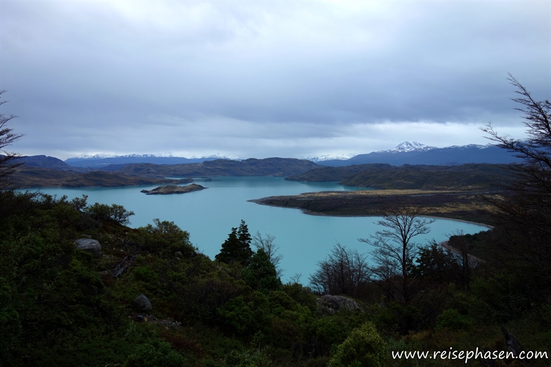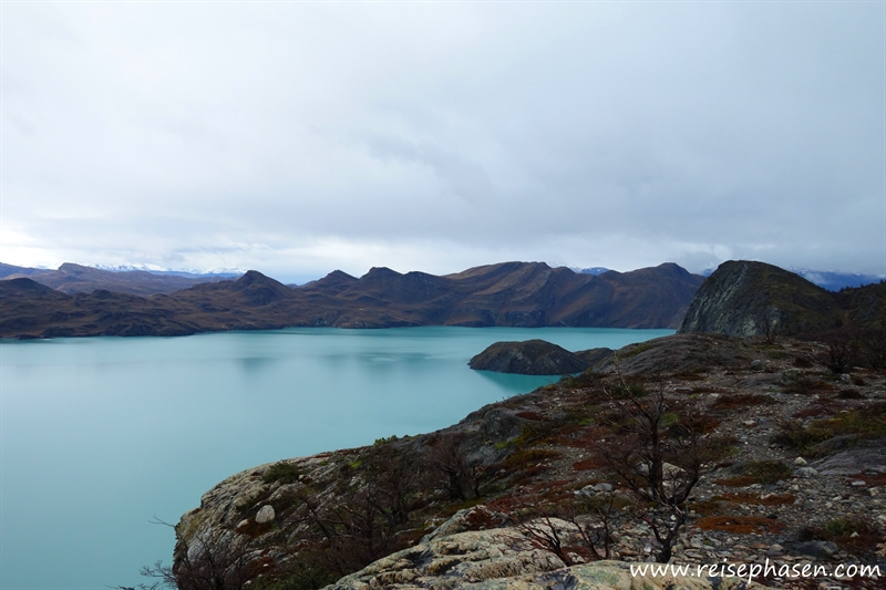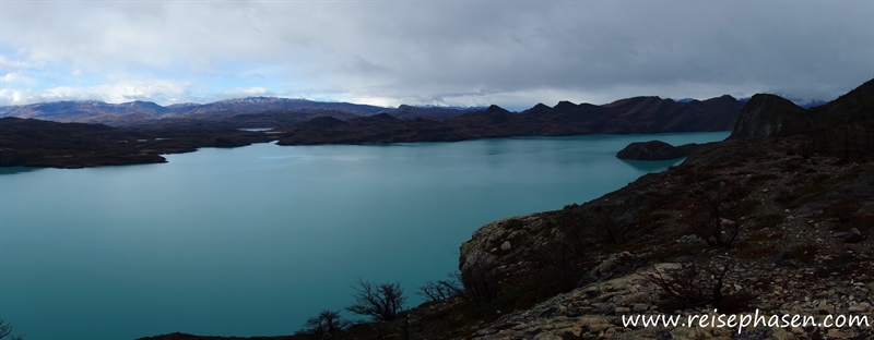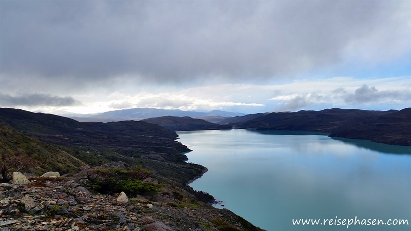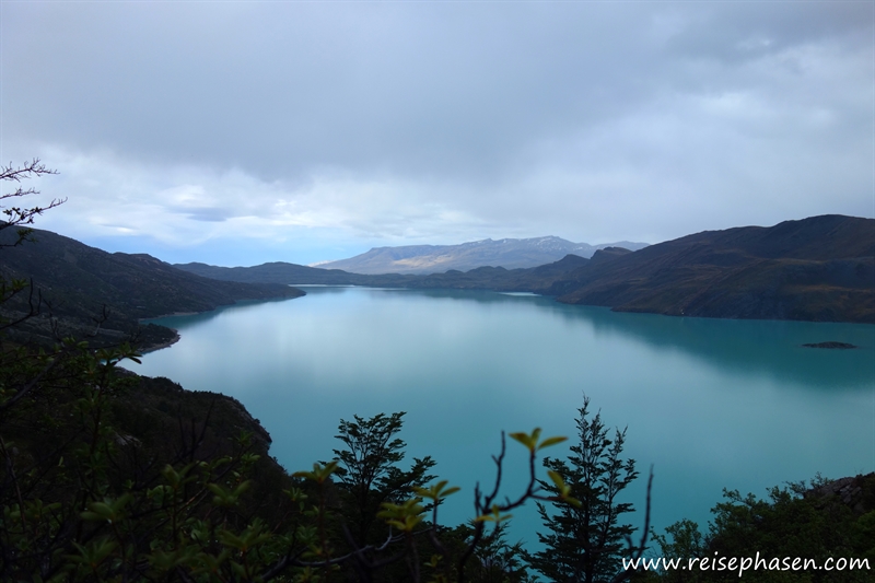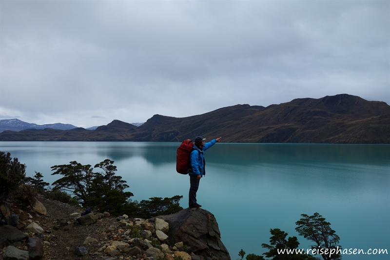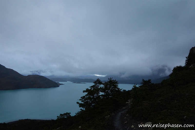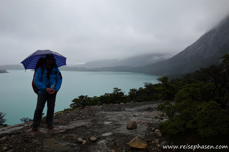 Der Weg kam uns wie eine Ewigkeit vor und es hörte einfach nicht auf zu Regnen. Über uns hingen dicke Wolken und Nebel. So entschlossen wir, als wir am Camp Italiano ankamen, uns kurz zu stärken und das zweite Tal auszulassen. Es wären weitere 6,5 km – 3,5 h ins Tal hinauf, im Regen und Nebel, gewesen. Und das gleiche wieder zurück. Wir kochten uns eine Suppe und gingen dann weiter zu unserem Tagesziel dem Camp Los Cuernos, 5,5 km – 2,5 h. Wir liefen oberhalb des Sees Nordenskjöld entlang. Es hörte nur mal für eine kurze Zeit auf zu Regnen. Da wir uns unterhalb des Nebel befanden hatten wir eine gute Sicht auf den Weg und den See. Am Camp angekommen wussten wir, dass hier Arbeiter sind um es für die Saison aufzubereiten, das hatte es auch gewaltig nötig. Nach einer Zeit sahen wir die Arbeiter. Wir fragten, ob wir den Campingplatz benutzen dürfen. Sie waren nicht gerade begeistert, aber letztendlich durften wir unser Zelt bei ihnen aufschlagen. Die Toilette war Mutter Natur. 😉