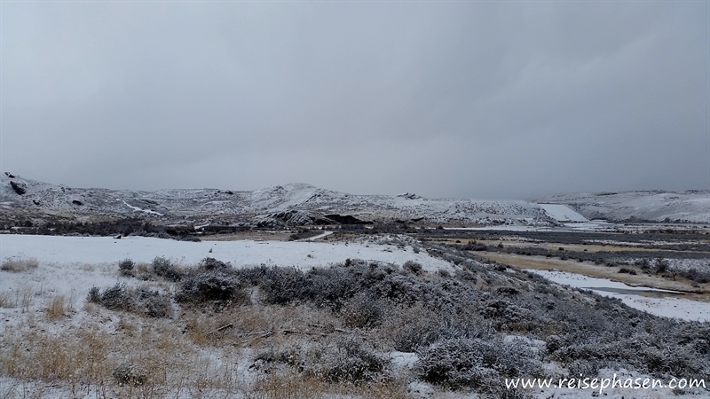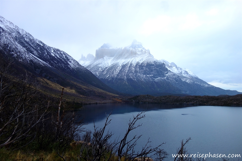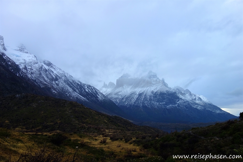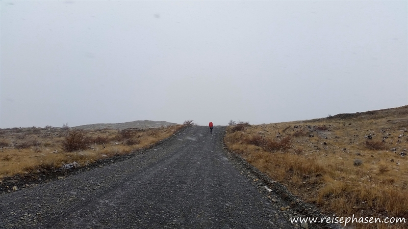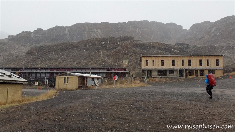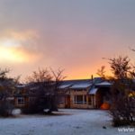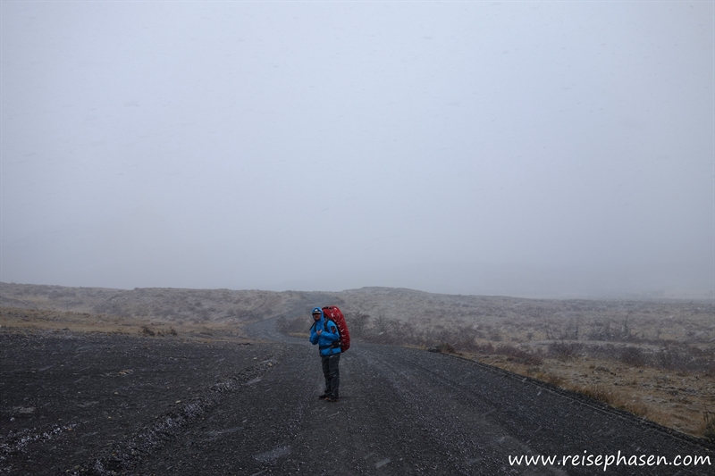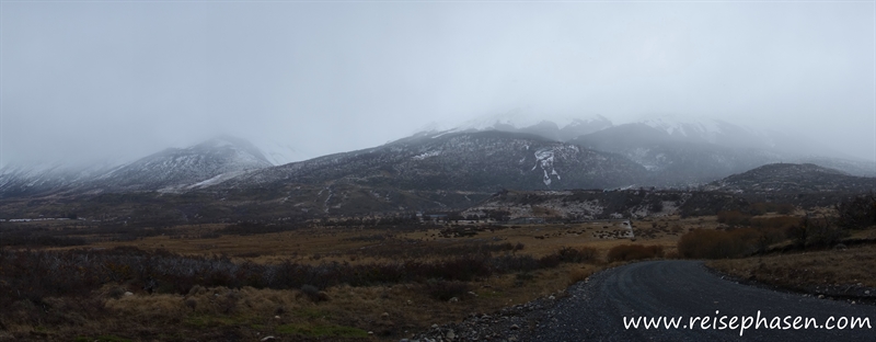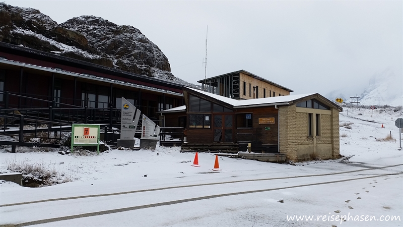 Wir durften unser Lager zwar nicht im Hotel aufschlagen, aber immerhin unter einem Vordach am Seiteneingang. Als wir am nächsten Morgen aufwachten war alles mit einer dünnen Schneeschicht bedeckt. Von dem Team in der Lodge wurden wir noch zu einem kleinen Frühstück eingeladen. Danach machten wir uns auf den Weg zum Parkeingang. Die letzten 7,5 km. Es schneite natürlich. 😉 Was waren wir froh als wir in der Rangerstation am Parkeingang ankamen und uns wieder vor einem warmen Ofen aufwärmen konnten. Wir hatten in unseren 5 Tagen alle Jahreszeiten einmal durchgemacht, Sonne, Regen, Wind und Schnee. Um 13 Uhr kam der Bus und brachte uns zurück nach Puerto Natales. Als wir aus dem Nationalpark herausfuhren kam das schönste Wetter wieder zum Vorschein.