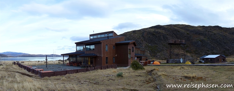 In der ersten Lodge waren Arbeiter, die uns aber nicht aufnehmen wollten. Der Campingplatz war noch geschlossen. Am Ende der Straße kamen wir zu einem größeren Hotel, was renoviert und für die kommende Saison vorbereitet wurde. Die Managerin hatte Mitleid mit uns und wir durften hineinkommen. Wir bekamen etwas warmes zu trinken und zu essen. Am Kaminofen durften wir uns aufwärmen. Kurze Zeit nach uns kam noch ein Pärchen aus der Österreichgruppe. Ihnen war das Wetter und der weitere Aufstieg zu den Torres auch nicht mehr geheuer. Sie waren bis auf die Unterhose nass.