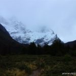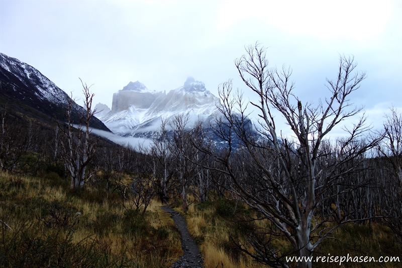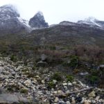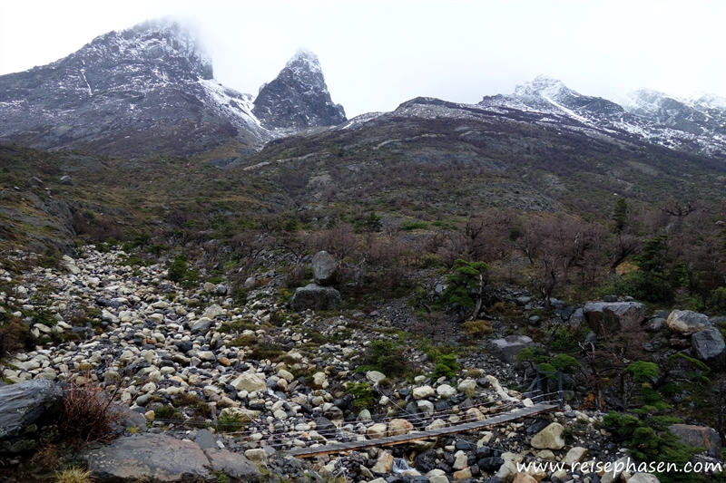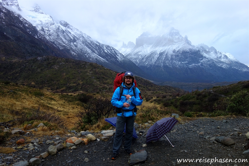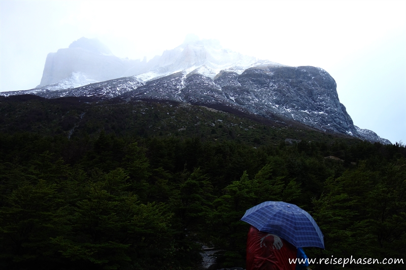 Wir kamen an die Kreuzung wo wir uns entscheiden mussten ob wir den Aufstieg ins letzte Tal, zum Highlight des Parks, den drei Türmen machen oder es ebenfalls wegen schlechtem Wetter auslassen und direkt zum letzten Refugio gehen. Wir wollten es probieren, trotz des schlechten Wetters. Von nun an ging es stetig bergauf. Durch den vielen Regen waren die Wege überflutet. Wir hüpften von Stein zu Stein, balancierten über Hölzer und schmissen Äste und Steine vor uns um irgendwie über die Wege zu kommen. Das Wetter wurde immer schlimmer. Dichter Nebel zog auf. Es wurde kalt. Es fing an zu schneien. Wir gingen weiter und weiter. Irgendwann kamen wir an ein großes abfallendes Matschfeld. Jörn versuchte es als erstes. Er rutschte aus. Konnte sich gerade noch auf deinen Beinen halten. Musste aber seine Hände zur Hilfe nehmen die komplett im Matsch verschwanden, wie auch seine Füße. Lisa stellte sich ein wenig geschickter an. Trotz beschissener Situation konnten wir uns vor lachen nicht mehr halten. Wir versuchten so gut es ging den Matsch zu entfernen. Mittlerweile waren unsere Füße klatsch nass. So langsam machte das alles keinen Spaß mehr. Wir gingen noch bis zur nächsten Kreuzung. Von dort konnten wir das Tal hinauf schauen, dicke Schneewolken, Nebel und der Regen steckten im Tal fest. Es hatte alles keinen Sinn mehr. So nass wie wir waren und dann bei 0 Grad im nassen Zelt. Nein danke. Wir entschlossen uns wieder abzusteigen und im Tal zu den Lodges zu gehen.